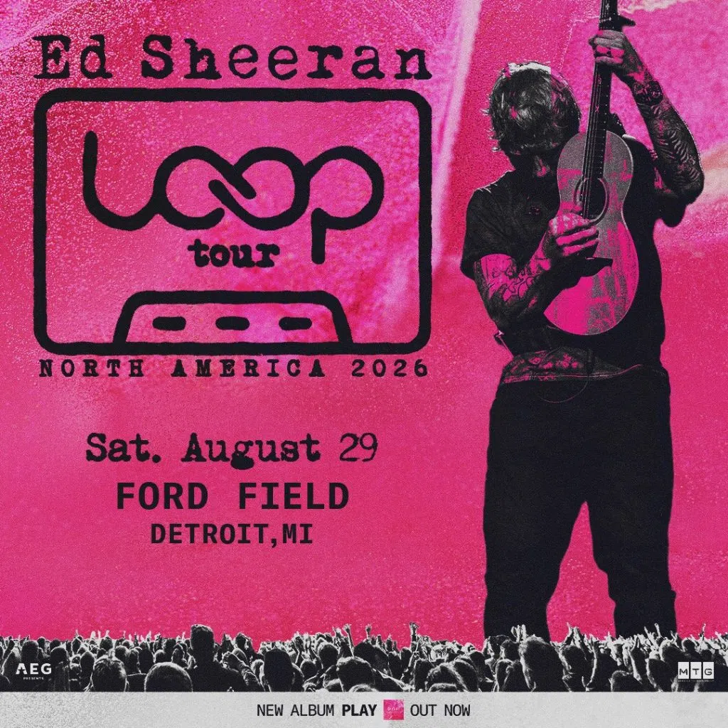 Ed Sheeran with special guests Myles Smith, Lukas Graham, and BIIRD will be performing at Ford Field in downtown Detroit on Saturday, August 29th, 2026 beginning at 5:30 pm as part of his “Loop Tour.”
